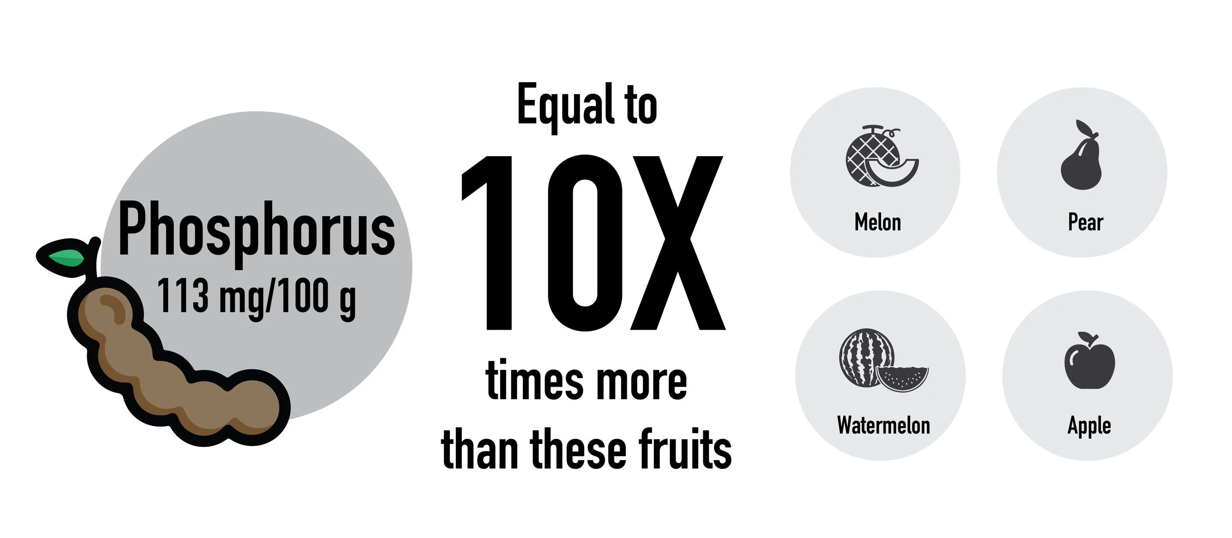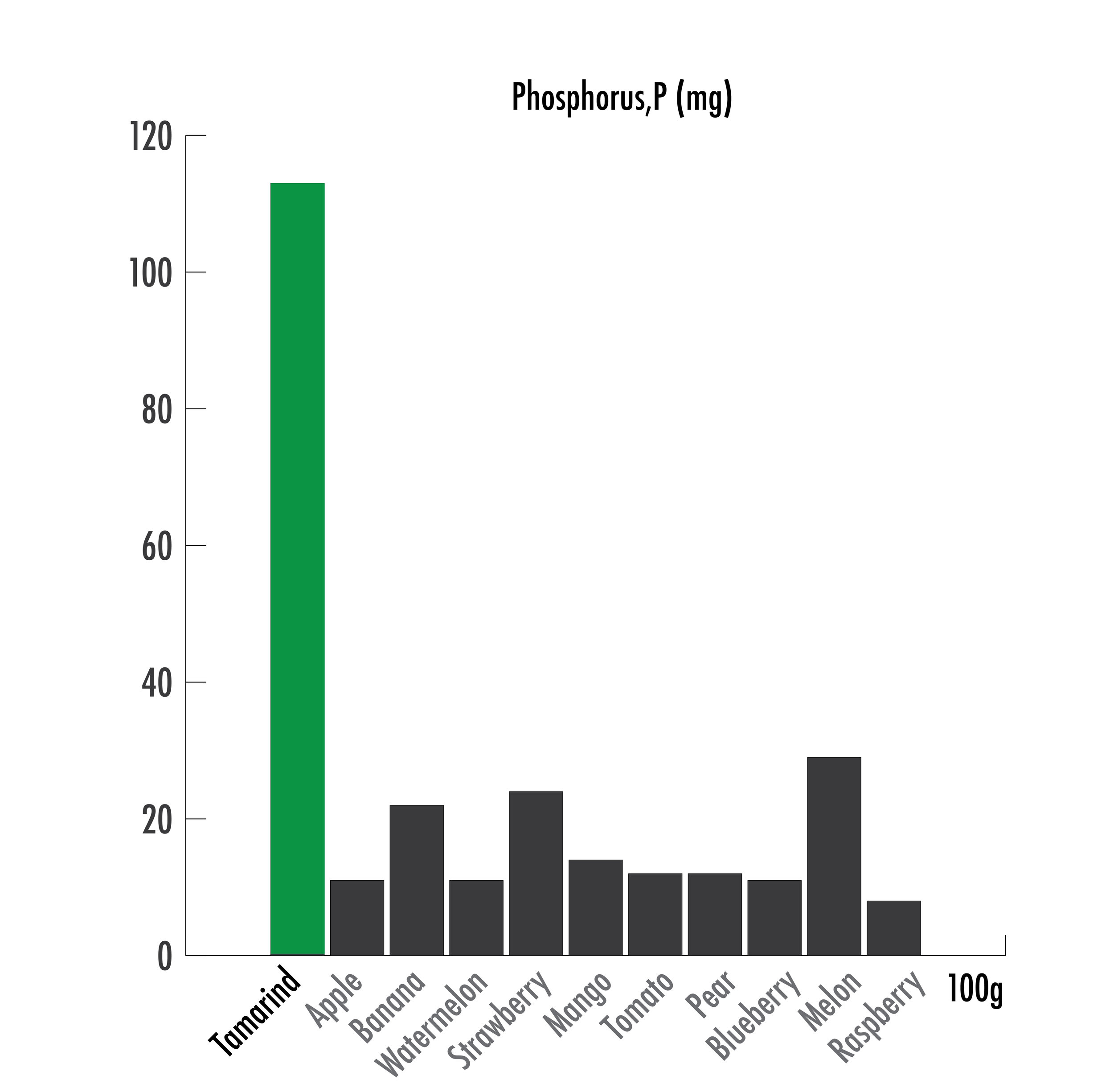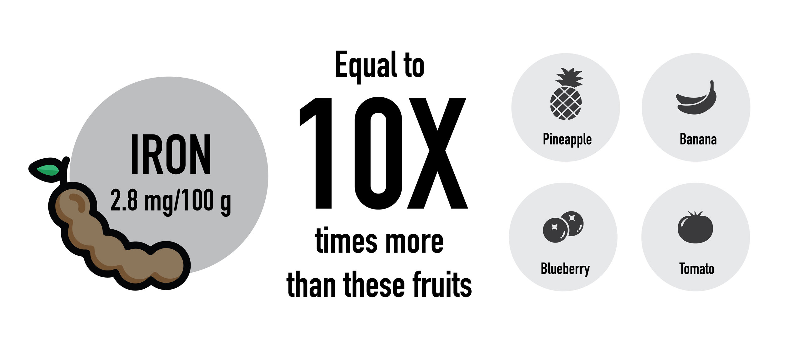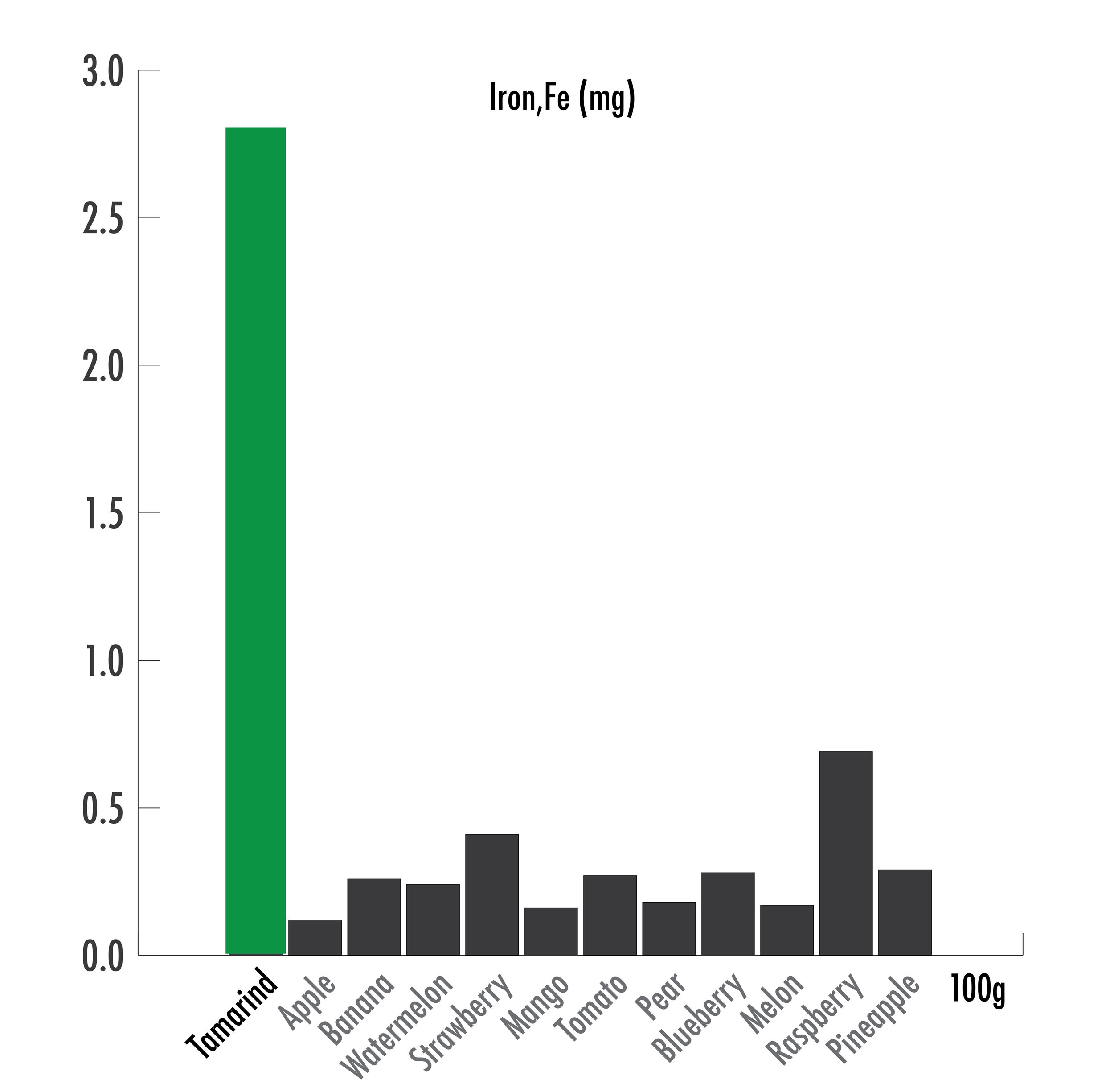 Tamarind is a good source of minerals, especially Iron and Potassium. Iron is essential for red blood cell production, while Potassium is an important component of cell and body fluids, which helps control heart rate and blood pressure.